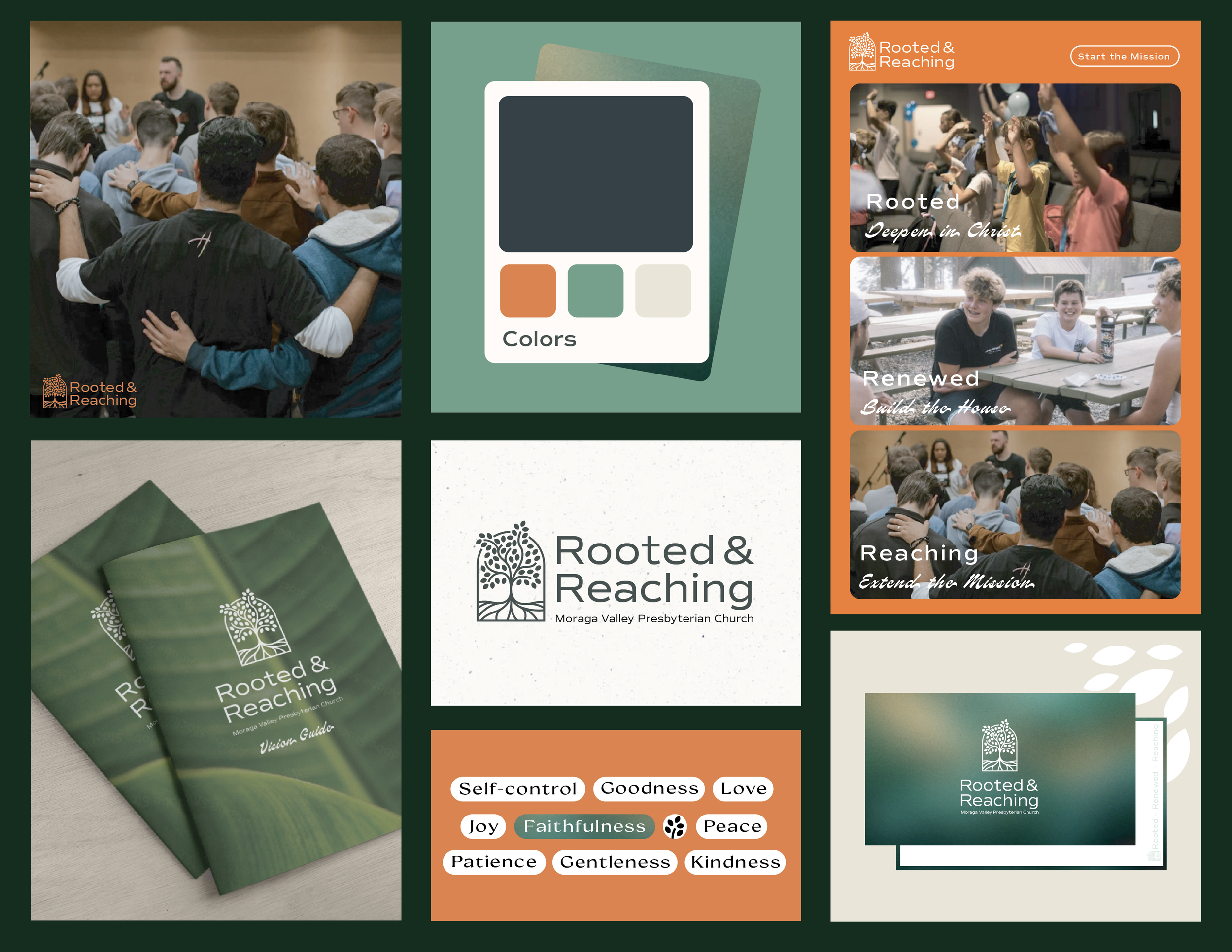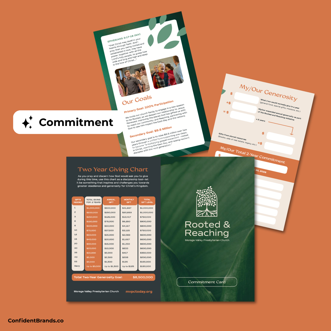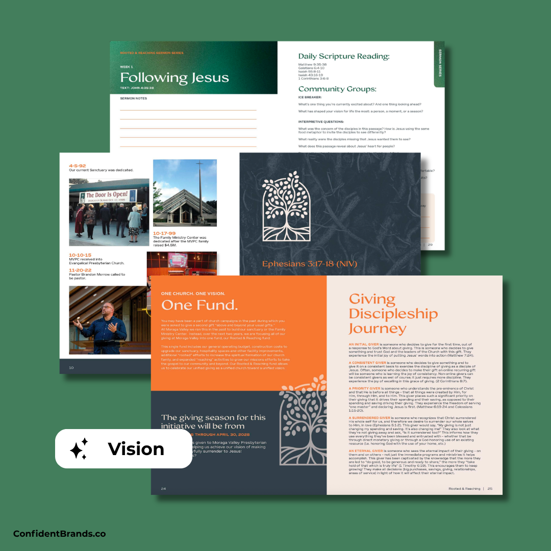 The Rooted & Reaching capital campaign was developed for Moraga Valley Presbyterian Church, located in Moraga Valley, California. Their team sought a distinctive logo and a cohesive visual system that reflected their mission to help one another follow Jesus.